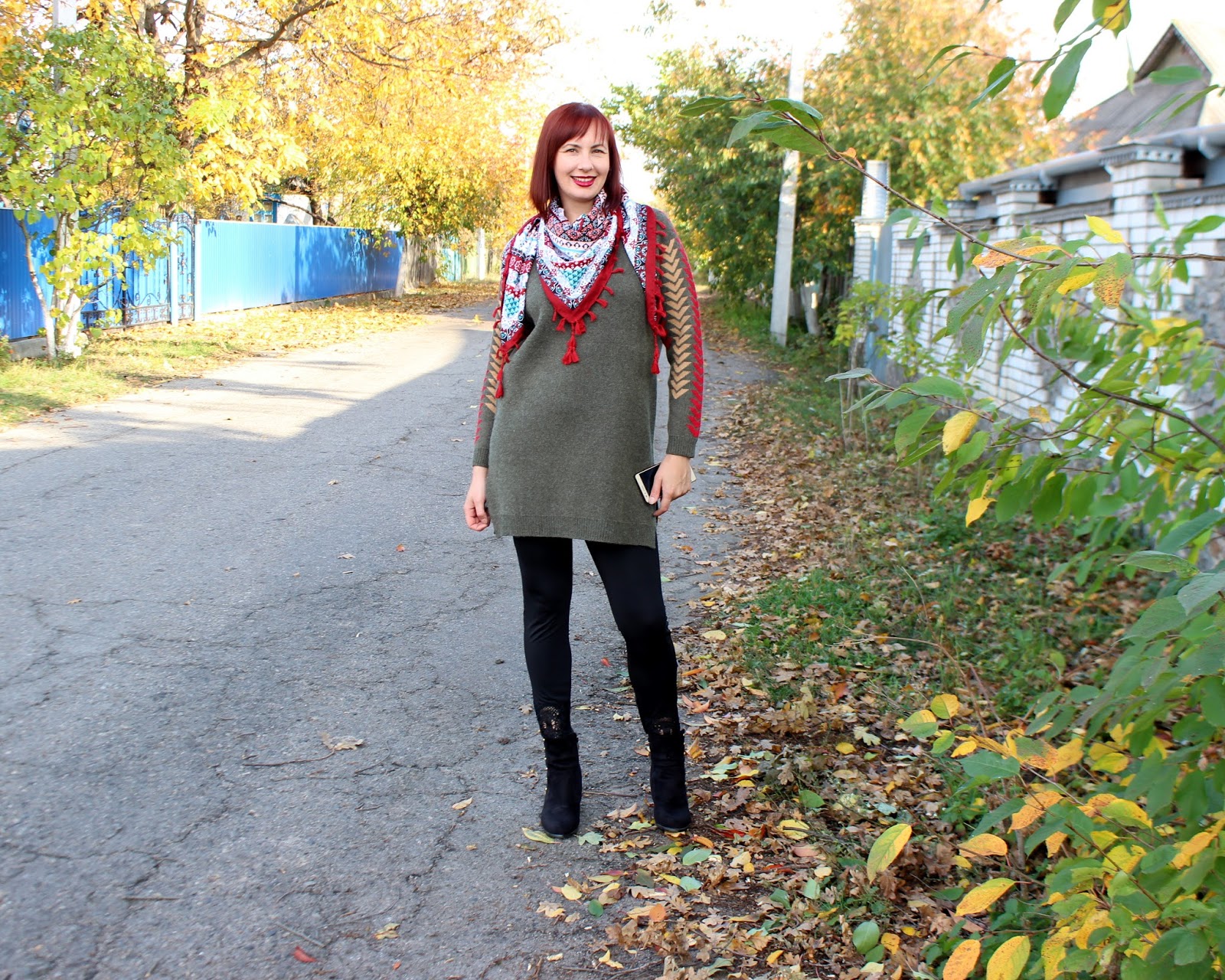 Geometric Slit Sweater Dress не устаю показывать свои вязаные платья, потому что в этот сезон и следующий они будут актуальными в женском гардеробе. Это платье-свитер скорее напоминает обычный удлиненный свитер, чем платье. Поэтому осенние ботинки и леггинсы его дополнили, как нельзя лучше.