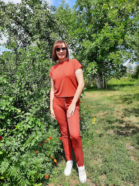 Hello friends! My last Femmeluxefinery store order was successful. I wear all the clothes. Today I will show you a beautiful terracotta jersey suit that I wore on the weekend.Трикотажный костюм двойка состоит из футболки и брюк. Ткань полиэстер, но воздух пропускает. В костюме не жарко, что важно для летнего зноя.