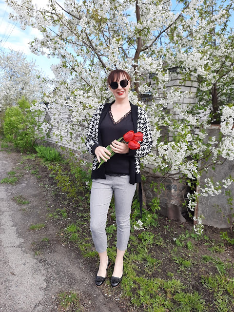 Today I put them on with a black blouse and cardigan. But they will also look great with a white blouse or T-shirt, light sweater. Shoes can be selected in a sporty style, sneakers or moccasins, ballet flats or pumps.